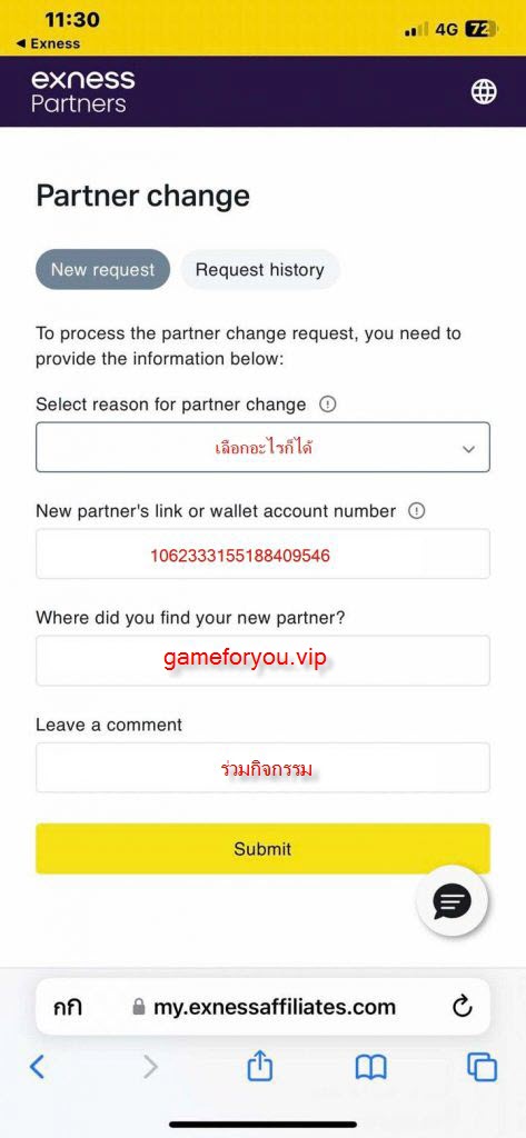 2.2.สำหรับผู้ที่มีเลขบัญชี exness อยู่แล้ว ก็ไม่ต้องสมัครใหม่ ให้ติดต่อ support exness ย้ายพาร์ทเนอร์มาที่ เลข 1062333155188409546 เสร็จแล้ว ให้เปิดเลขพอตใหม่เพื่อใช้รับเงินรางวัล แจ้งมาทาง line